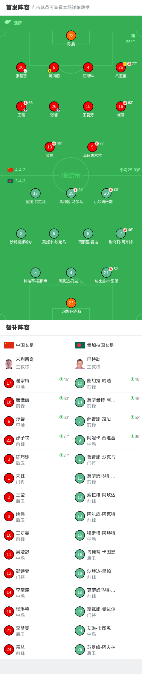 第62分钟,张馨、唐佳丽替补出场,刘靖、王霜被换下