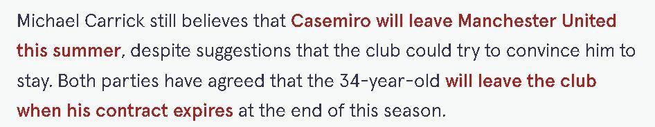 卡里克在赛后承认,卡塞米罗的状态使他成为当前球队不可或缺的一员。只是虽然有传言称曼联可能会试图挽留卡塞米罗,卡里克仍然认为巴西中场今夏会离开,他在合同期满后自由转会,已经通过俱乐部进行了官宣。